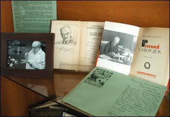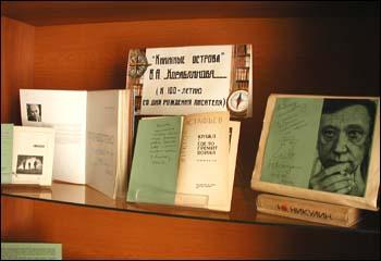 На выставке представлены книги с автографами из библиотеки писателя. Заслуживают внимания имена дарителей: В. Песков, Ю. Никулин, В. Астафьев.