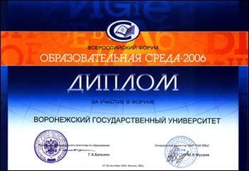 С 27 по 30 сентября 2006 года Воронежский госуниверситет участвовал в проходящем в павильоне № 57 Всероссийского выставочного центра (г. Москва) 8-м Всероссийском форуме "Образовательная среда - 2006", организованном Министерством образования и науки РФ.