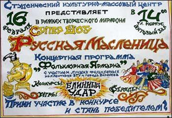 В главном корпусе ВГУ состоялось интересное мероприятие "Фольклорная ярмарка. Проводы русской зимы. Масленица". В концертной программе было показано, как издавна провожали зиму - праздновали Масленицу.