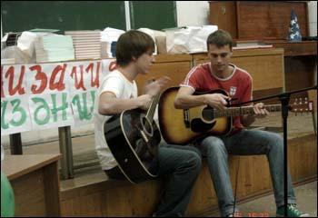 Театральное действо сменяется музыкальным жанром: дуэт студентов на гитаре поддерживает волну позитива и зажигательную атмосферу. Ведь журфак еще не вырос из того возраста, когда можно позволить себе пошалить, повеселиться и заразить окружающих своей энергией и звонким смехом.