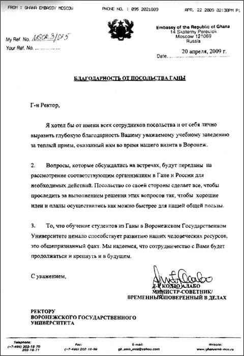 По итогам визита на имя ректора ВГУ проф. Владимира Титова пришло благодарственное письмо из посольства Ганы, в котором, в частности, выражена глубокая благодарность за тёплый приём, отмечено, что «обучение студентов из Ганы в Воронежском государственном университете немало способствует развитию наших человеческих ресурсов, это общепризнанный факт», выражена надежда на дальнейшее сотрудничество.