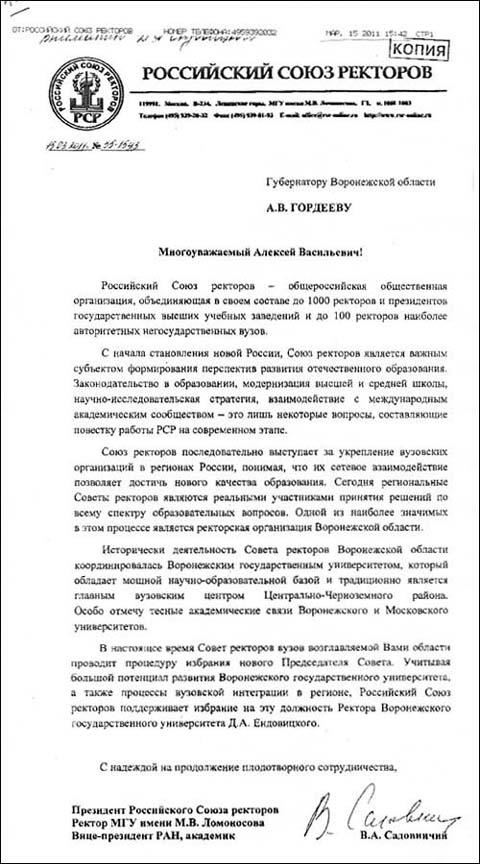 В настоящее время Совет ректоров вузов возглавляемой Вами области проводит процедуру избрания нового Председателя Совета. Учитывая большой потенциал развития Воронежского государственного университета, а также процессы вузовской интеграции в регионе, Российский Союз ректоров поддерживает избрание на эту должность Ректора Воронежского государственного университета Д.А. Ендовицкого.»