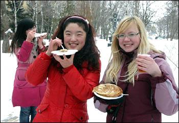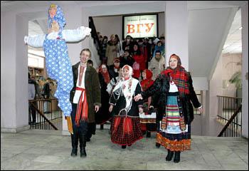 Фольклорные коллективы университета помогли всем присутствующим окунуться в атмосферу традиционного празднования русской масленицы — с песнями, играми, хороводами, сжиганием чучела зимы и, конечно, блинами.