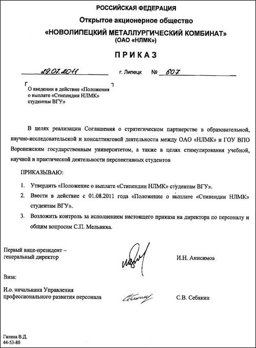 В рамках реализации Соглашения о стратегическом партнерстве в образовательной, научно-исследовательской и консалтинговой деятельности между ВГУ и ОАО «НЛМК» и с целью продолжения успешного сотрудничества руководство одной из крупнейших металлургических компаний в мире приняло решение о выплате «Стипендий НЛМК» наиболее талантливым студентам университета, успешно прошедшим конкурсный отбор.