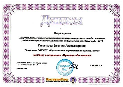 Выпускница кафедры программного обеспечения и администрирования информационных систем (ПОиАИС) факультета прикладной математики, информатики и механики ВГУ Евгения Пигалкова стала лауреатом Всероссийского студенческого конкурса выпускных квалификационных работ по специальности «Прикладная информатика (по областям)» и была награждена дипломом за победу в номинации «Правовое обеспечение».