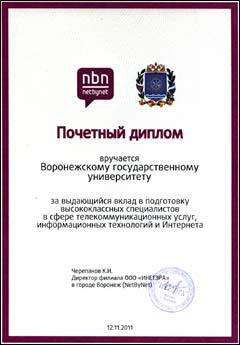 Воронежский филиал компании «Инетэра» (NetByNet) вручил Воронежскому государственному университету почётный диплом «за выдающийся вклад в подготовку высококлассных специалистов в сфере телекоммуникационных услуг, информационных технологий и интернета».