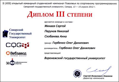 Две команды студентов ПММ ВГУ приняли участие в II (XIII) студенческом командном чемпионате Поволжья по спортивному программированию, проходившем в Самаре (на базе Самарского государственного университета). Выступление ребят было успешным: каждая из команд завоевала диплом третьей степени.