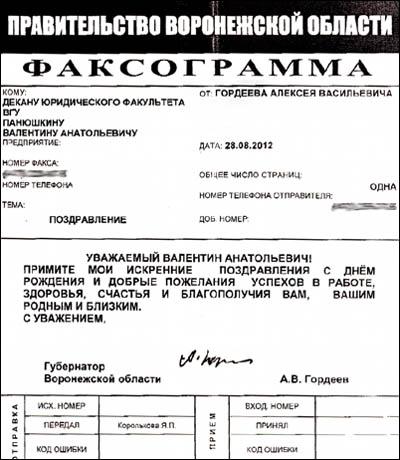 На имя декана юридического факультета ВГУ, профессора Валентина Панюшкина получена факсограмма с поздравлениями по случаю дня рождения от губернатора Воронежской области Алексея Гордеева.