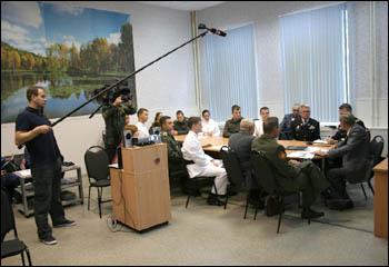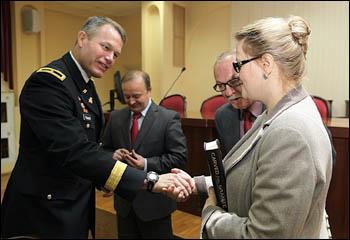 Программа визита делегации Военной Академии США также включала в себя встречу с преподавателями и студентами на факультете военного образования ВГУ, кадетами Вест–Пойнт, проходящими в настоящий момент обучение в Воронежском государственном университете.