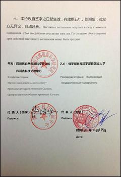 Руководство Воронежского университета также подписало трёхстороннее соглашение с НИИ природных ресурсов и Центром по научным обменам провинции Сычуань, позволяющее создать два МИПа по технологиям охраны окружающей среды и биотехнологиям.