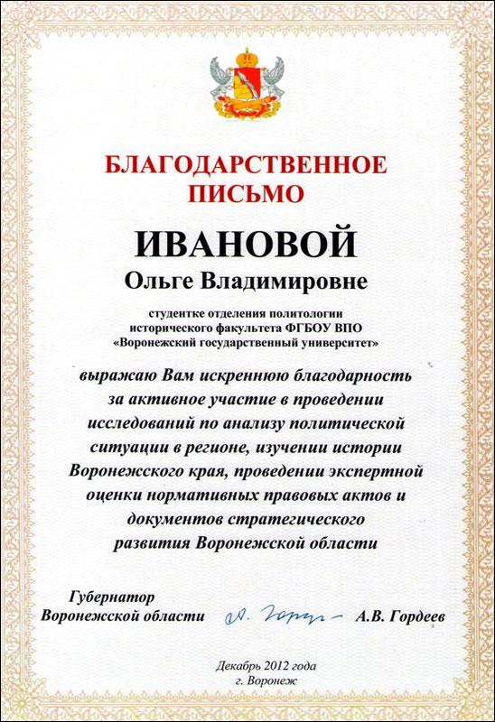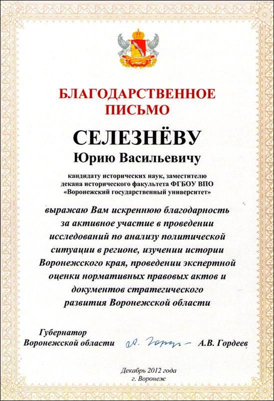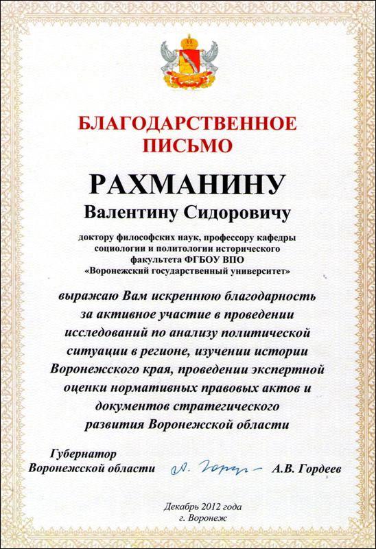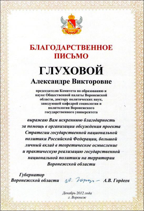 Губернатор Воронежской области Алексей Гордеев направил благодарственные письма в адрес сотрудников исторического факультета ВГУ. В них он поблагодарил заведующую кафедрой социологии и политологии, профессора Александру Глухову за «помощь в организации обсуждения проекта Стратегии государственной национальной политики Российской федерации, большой личный вклад в теоретическое осмысление и практическую реализацию государственной национальной политики на территории Воронежской области», профессора кафедры социологии и политологии Валентина Рахманина, заместителя декана факультета по науке, доцента кафедры истории России Юрия Селезнёва и студентку отделения «Политология» Ольгу Иванову за «активное участие в проведении исследований по анализу политической ситуации в регионе, изучение истории Воронежского края, проведении экспертной оценки нормативных правовых актов и документов стратегического развития Воронежской области».