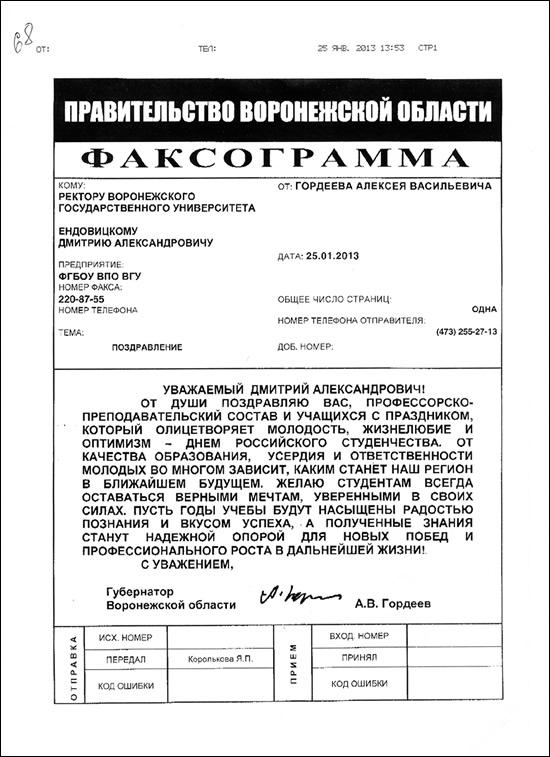 На имя ректора ВГУ, профессора Дмитрия Ендовицкого получена факсограмма от губернатора Воронежской области Алексея Гордеева.