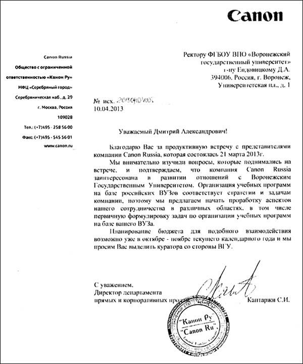 На имя ректора ВГУ, профессора Дмитрия Ендовицкого получено письмо от директора департамента прямых и корпоративных продаж ООО «Канон Рус» С.И. Кантаржи.