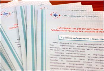Главный специалист Управления по работе с персоналом Воронежского филиала ОАО «РОСТЕЛЕКОМ» Наталия Плужникова провела презентацию предприятия, рассказав об открытии «Колцентра», которому потребуется много энергичных креативных молодых специалистов. Ведущий менеджер по персоналу ЗАО «ЭФКО» Татьяна Стрельченко также рассказала о своем предприятии и пригласила выпускников на работу.