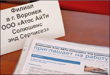 От работодателей первым выступил руководитель Центра подготовки специалистов филиала в г. Воронеже ООО «Атос АйТи Солюшенс энд Сервисе» Сергей Кенин. Комментируя презентацию компании, он давал слово сотрудникам своей организации – они зачитывали списки вакансий и разъясняли, чем конкретно будут заниматься выпускники в том случае, если пойдут к ним на работу.
