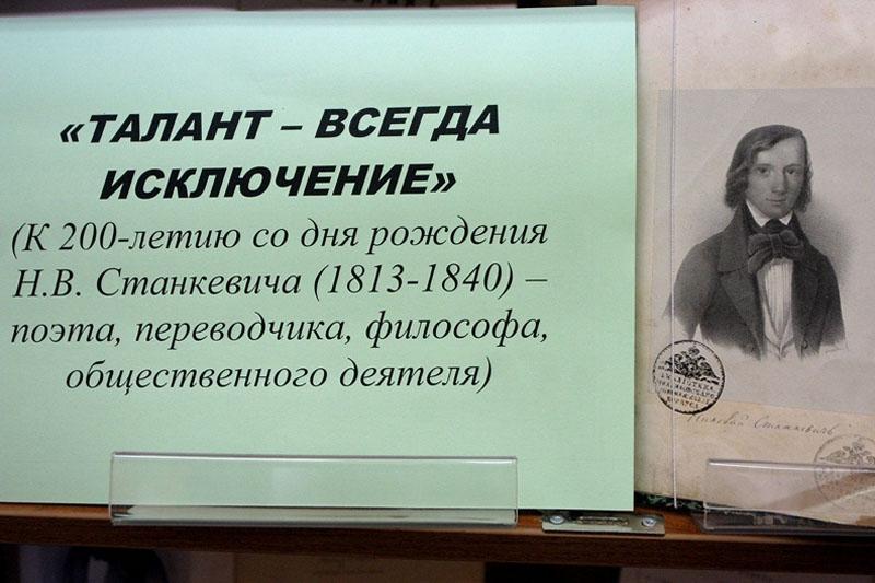 В Отделе редких книг ЗНБ ВГУ открыта выставка «Талант – всегда исключение», посвященная 200-летию со дня рождения Николая Владимировича Станкевича (1813–1840) – русского литератора, философа, поэта.