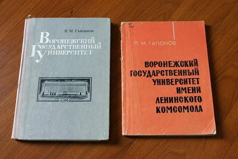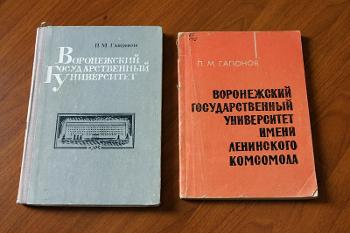 Необходимо назвать две небольшие книги П.М. Гапонова «Воронежский государственный университет имени Ленинского комсомола» (Воронеж, 1968) и «Воронежский государственный университет» (Воронеж, 1970), в которых автор уделил внимание вопросу образования Воронежского университета.