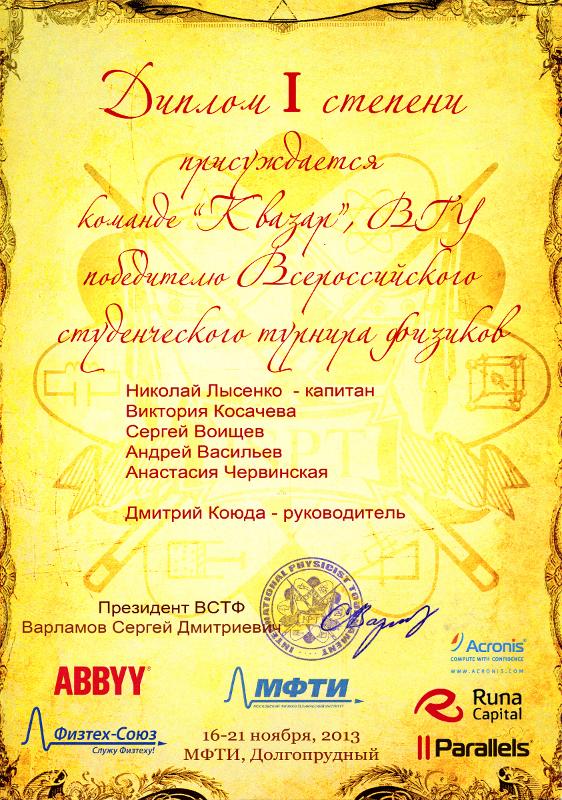 Завершился пятый Всероссийский студенческий турнир физиков (ВСТФ), проходивший с 17 по 21 ноября на базе Московского физико-технического института (МФТИ). В этом году город Воронеж представляли сразу три команды, а всего в турнире приняли участие 11 команд: 2 из МФТИ, 3 из Воронежа и по одной команде от ЮУрГУ (Челябинск), МГУ (совместно с СПбГУ), САФУ (Архангельск), ГАГУ (Алтайский край), Северска и Томска.