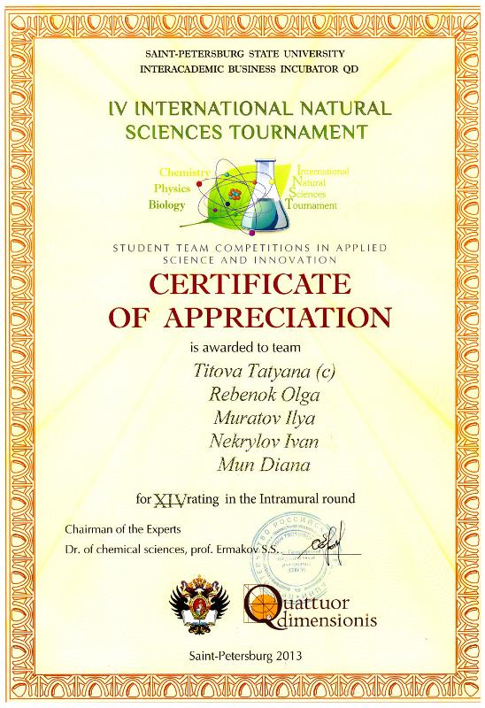 По окончании мероприятия всем участникам турнира были вручены сертификаты участника Международной научной школы «Applied Chemistry and Materials Science» и Международного турнира естественных наук.