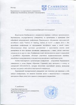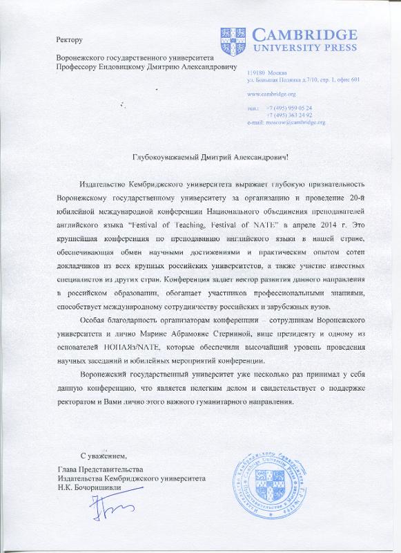 Издательство Кэмбриджского университета выражает благодарность коллективу Воронежского государственного университета в лице ректора Дмитрия Ендовицкого за организацию и проведение 20-й международной конференции Национального объединения преподавателей английского языка «Festival of Teaching, Festival of NATE».