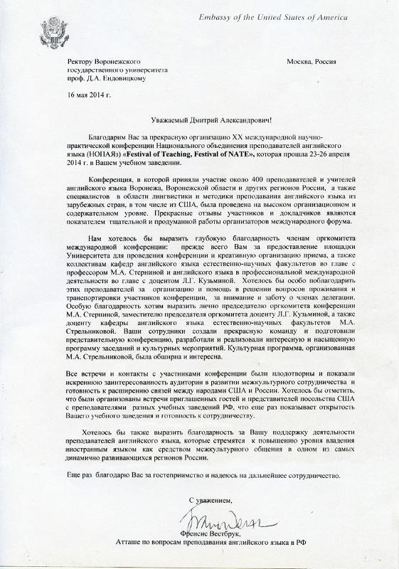 Атташе по вопросам преподавания английского языка в РФ Френсис Вестбрук выражает благодарность коллективу Воронежского государственного университета в лице ректора Дмитрия Ендовицкого за организацию 20-й международной конференции Национального объединения преподавателей английского языка «Festival of Teaching, Festival of NATE».