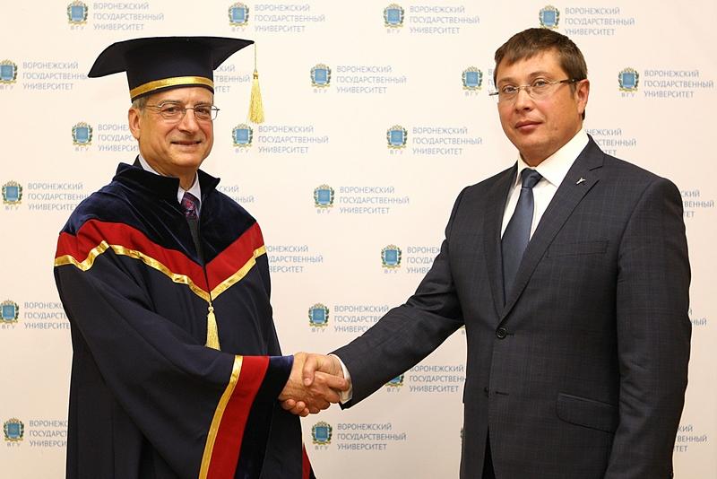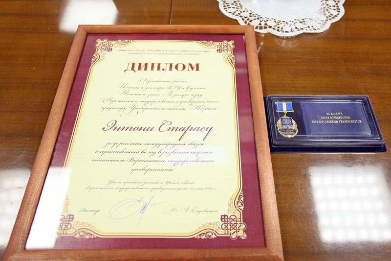 – Вручение Почётного знака ВГУ, мантии и диплома стало славной традицией нашего университета. В список почетных докторов ВГУ входят ректор МГУ им. М.В. Ломоносова Виктор Садовничий, Чрезвычайный и Полномочный Посол Германии в России господин Ульрих Бранденбург, Нобелевский лауреат Жорес Алферов, Святейший Патриарх Кирилл. Сегодня в наших стенах мы принимаем профессора университета штата Небраска, нашего доброго друга и партнера Энтони Стараса. Мы благодарны профессору Старасу за то, что он продвигает ВГУ в мировой науке. Символично, что вручение высшей награды университета проходит в день открытия Приемной кампании в российских вузах.