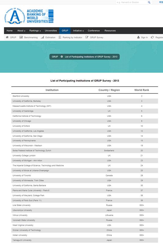 Global Research University Profiles (GRUP) в 2013 году охватил 1200 исследовательских университетов в мире. Основанный на данных, о которых сообщают университеты, и полученных от третьих лиц, GRUP представляет сравнения университетов в различных областях и/или в различных географических группах с точки зрения 40 индикаторов.