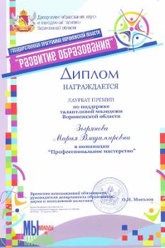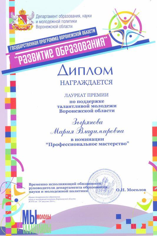 20 сентября в рамках празднования Дня города Воронежа состоялось торжественное награждение победителей конкурсных мероприятий – лауреатов премий по поддержке талантливой молодежи Воронежской области по пяти номинациям: «Мы создаем будущее», «Меня оценят», «Культпоход», «Моя профессия», «Мы за здоровый образ жизни». Преподаватель кафедры французской филологии факультета романо-германской филологии Воронежского государственного университета Мария Зырянова стала одним из лауреатов номинации «Моя профессия».