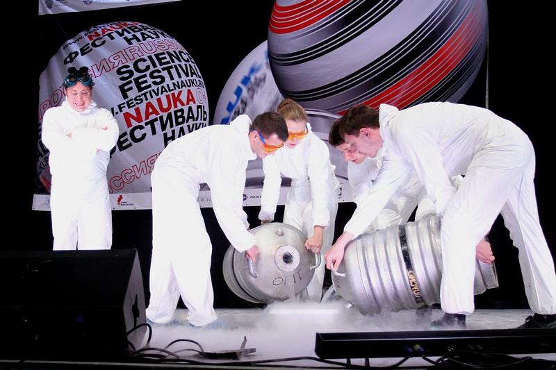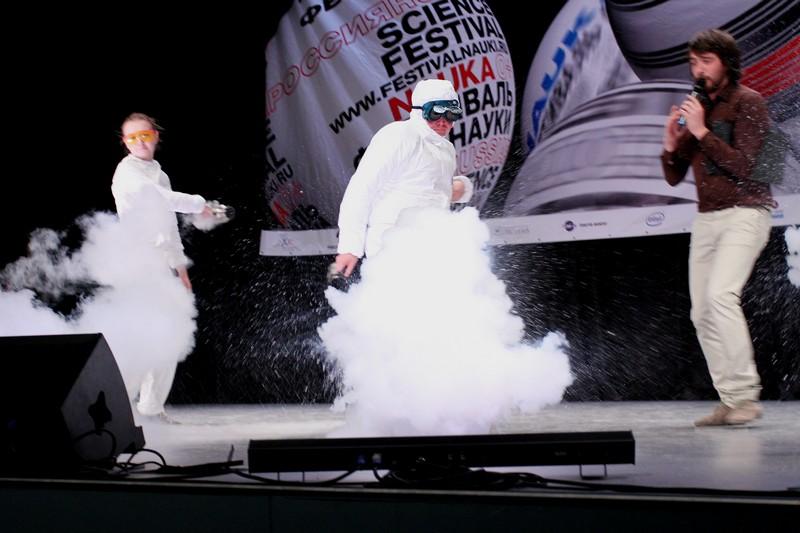 Финал Фестиваля науки преподнес участникам множество сюрпризов, один из которых – яркий эксперимент с жидким азотом, проведенный на сцене Дмитрием Ендовицким и командой физиков и химиков ВГУ Creative Science. Творческие коллективы города выступили с танцевальными и вокальными номерами.