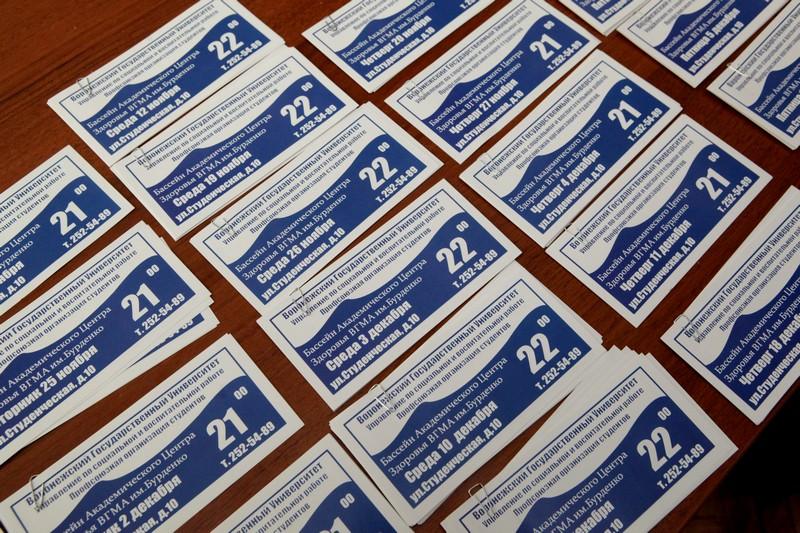 29 октября в актовом зале Главного учебного корпуса ВГУ силами активистов профсоюзной организации студентов ВГУ была организована выдача абонементов в бассейн “Академический Центр здоровья ВГМА им. Н.Н. Бурденко” и на ледовую арену “Северное сияние”.