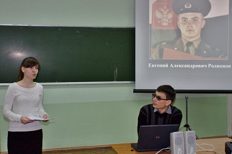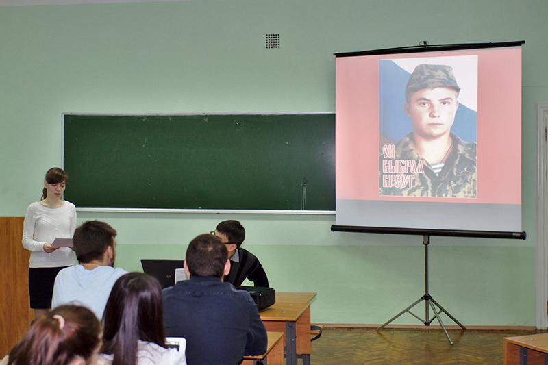 О герое студентам рассказала его мама Надежда Шибилкина. Президент ВРОО «Ветераны спецподразделений СОБР» Алексей Климов показал короткометражный документальный фильм о деятельности организации. Собравшиеся вспомнили подвиг псковских десантников, геройски сражавшихся в неравной схватке с тысячами боевиков на высоте 776 под Улус-Кертом 29 февраля – 1 марта 2000 года.