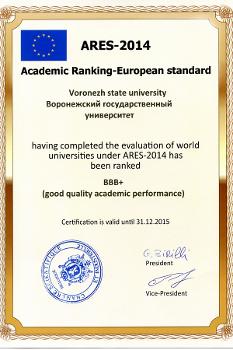 Воронежский государственный университет вошел в рейтинг Academic Ranking-European standard (ARES), публикуемый Европейской научно-промышленной палатой. В Еврорейтинге-2014 ВГУ вошел в категорию вузов, уровень которых оценен экспертами на BBB+.