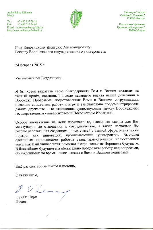 Благодарственные письма / Просмотров: 3670На имя ректора Воронежского государственного университета Дмитрия Ендовицкого пришло благодарственное письмо от Чрезвычайного и Полномочного Посла Ирландии в России господина Оуна О’Лири.