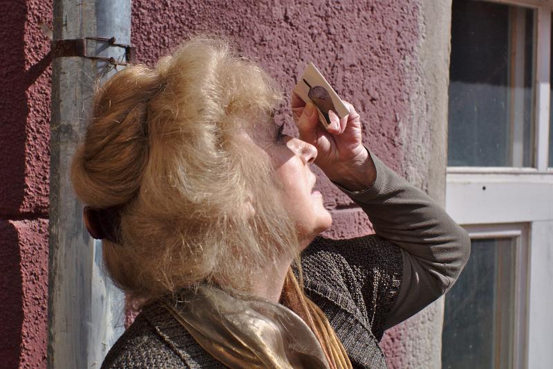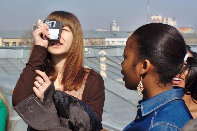 Не остались в стороне также любители астрономии из числа сотрудников университета: ещё одна точка наблюдения была организована во дворе главного корпуса стараниями доцента факультета ПММ Елены Михайловой. Наблюдениям здесь сопутствовала массовая раздача старых дискет, и смотреть сквозь них на Солнце для многих оказалось куда интереснее, нежели в телескоп.