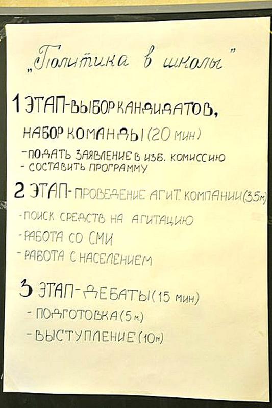 После выступления представителей кафедры студенты второго курса исторического факультета направления «Политология» Никита Ткаченко и Денис Штрек рассказали ребятам о структуре работы МО РАПН. После чего председатель ВРО МО РАПН Кирилл Пахотин подробно осветил главные этапы игры «Выборы», и все приступили выполнять свои функции. Проект помог школьникам повысить свою политическую культуру и продуктивно провести время. Ребята узнали о предвыборной агитации, о лоббизме и дебатах, не только в теории, но и на практике, взяв на себя роль той или иной «сферы-силы» избирательной компании.
