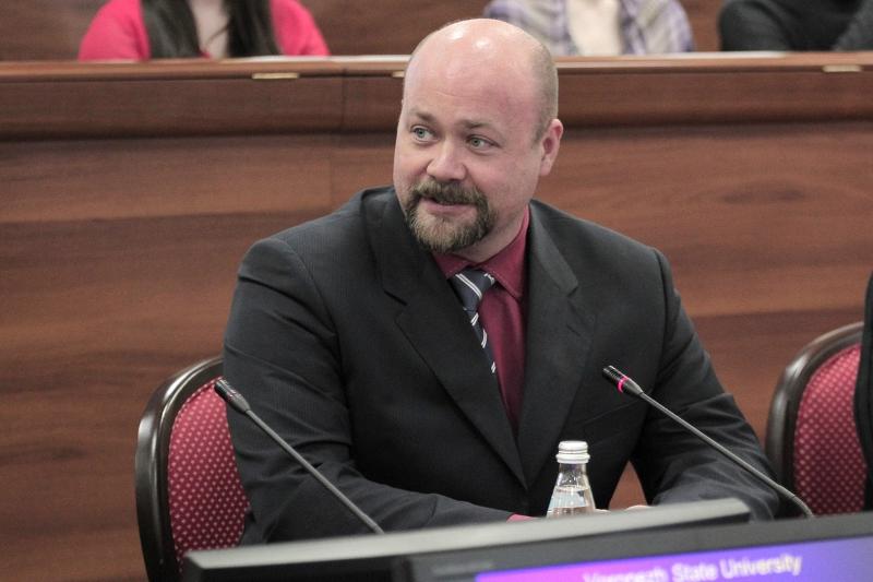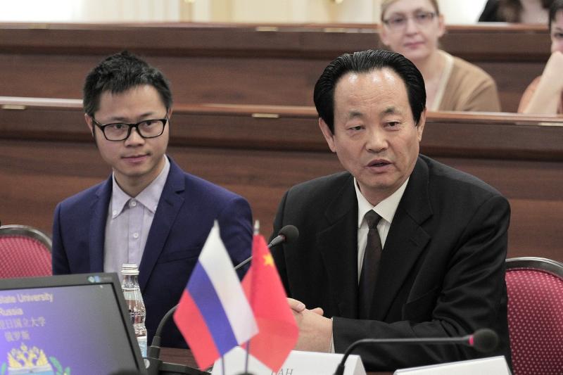Ректор ВГУ Дмитрий Ендовицкий выступил перед китайской делегацией с презентацией об истории Воронежа и университета, о структуре вуза, о тех позициях, которые ВГУ занимает в международных рейтингах, о факультетах и работе, осуществляемой профессорско-преподавательским составом.