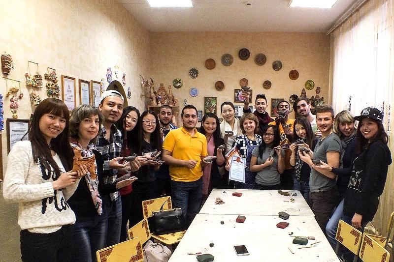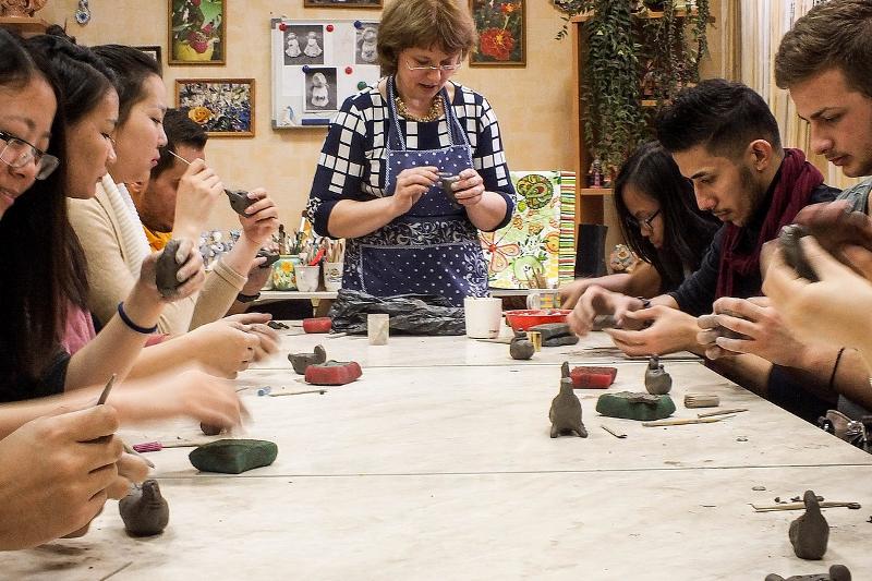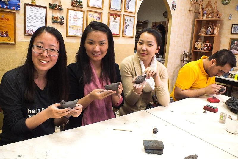 Педагог дополнительного образования Наталья Пророк провела для иностранных гостей мастер-класс по изготовлению глиняной игрушки. На гончарном круге они самостоятельно сделали разнообразные поделки, после чего получили их в подарок.