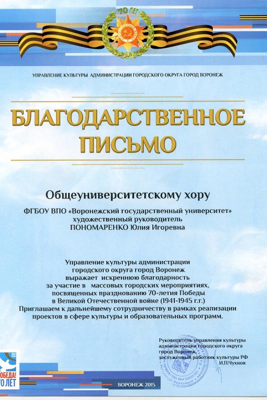 За участие в массовых городских мероприятиях, посвященных празднованию 70-летия Победы в Великой Отечественной войне, общеуниверситетский хор ВГУ получил благодарственное письмо от Управления культуры администрации городского округа город Воронеж и приглашение к дальнейшему сотрудничеству в реализации проектов в сфере культуры и образовательных программ. Девятого мая этого года состоялся успешный дебют хора – на площади Ленина состоялось грандиозное хоровое шоу, в котором приняли участие 1200 человек, среди которых были университетские хористы. Также хор выступал на собственной творческой площадке Воронежского госуниверситета.