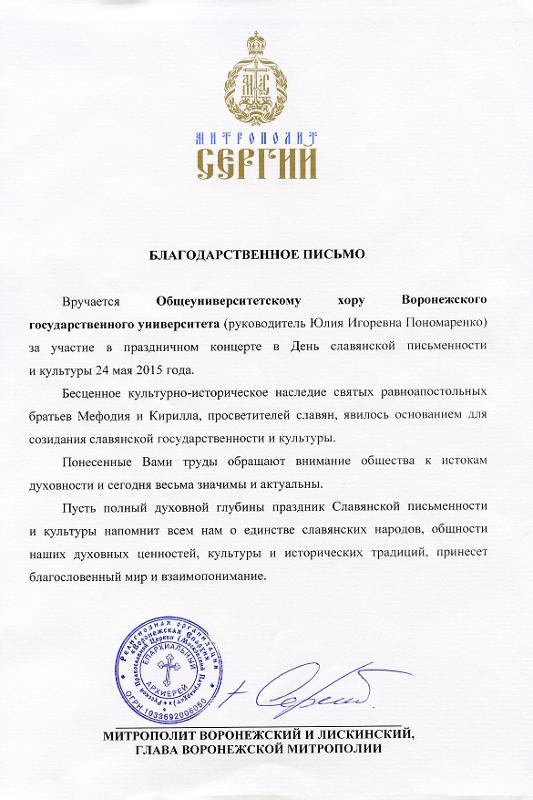Кроме того, за участие в праздничном концерте в День славянской письменности и культуры 24 мая общеуниверситетскому хору ВГУ от имени Митрополита Воронежского и Лискинского Сергия было вручено благодарственное письмо и памятный подарок – икона Явление Пресвятой Богородицы преподобному Сергию Радонежскому. Молодой хор ВГУ принимал участие в праздновании наравне с ведущими хоровыми коллективами города Воронежа: хор Оперного театра, Академии искусств, музыкального училища имени Ростроповичей, ВГПУ, Воронежского музыкально-педагогического колледжа, Академический симфонический оркестр Филармонии под управлением Игоря Вербицкого.