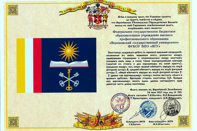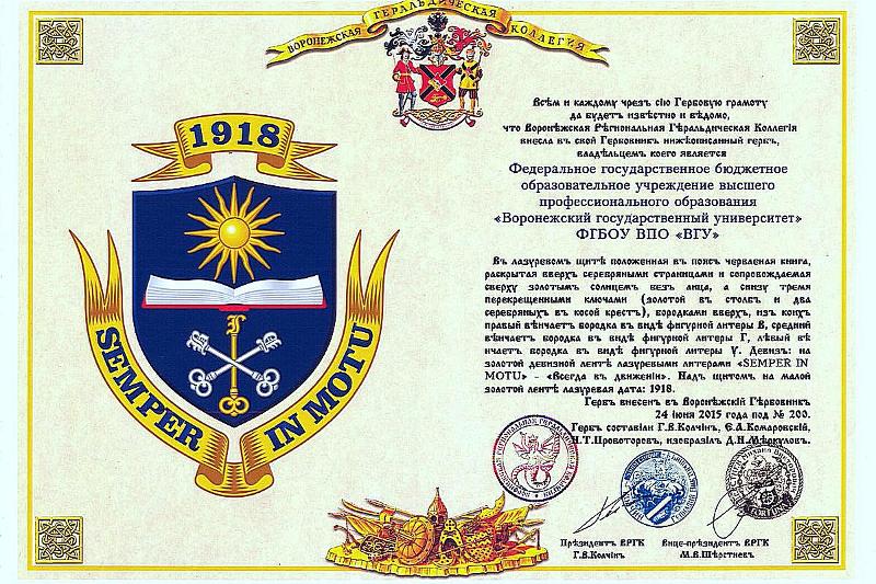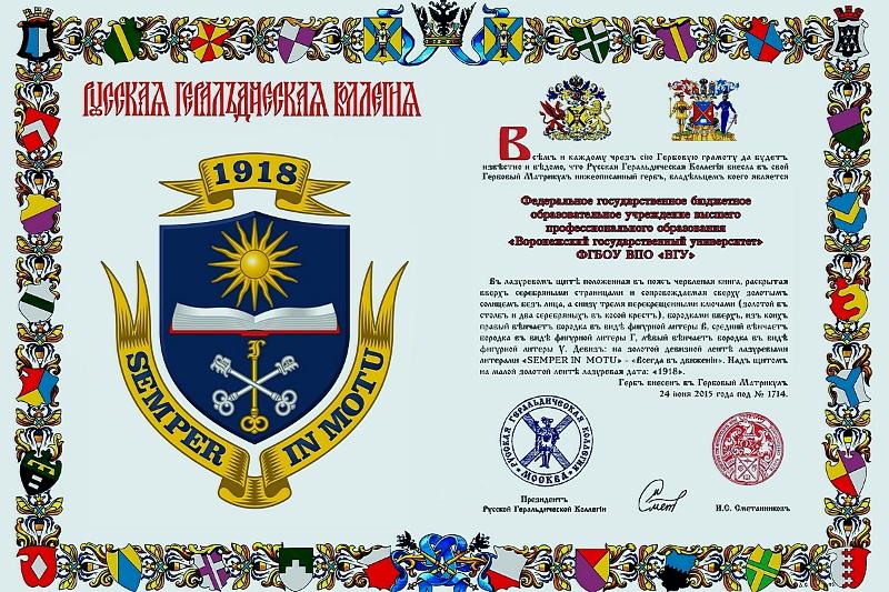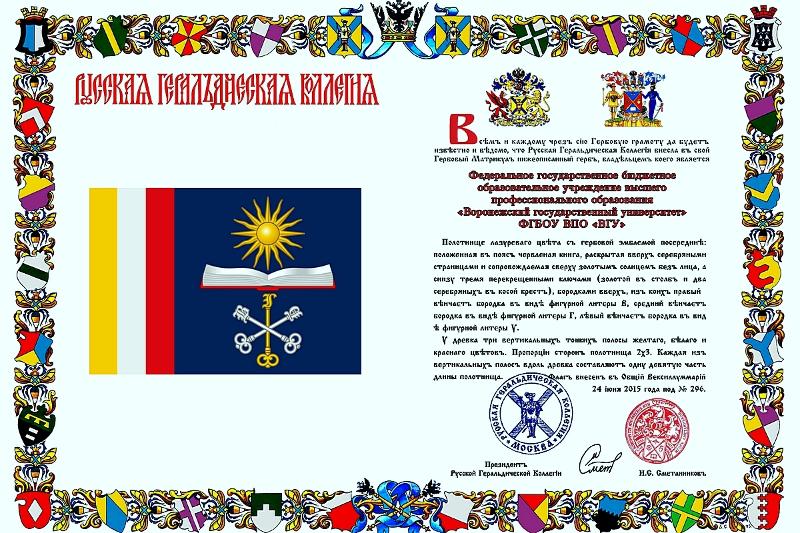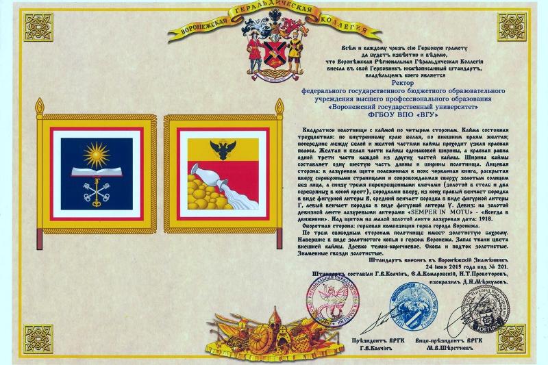 Воронежский государственный университет получил свидетельства о регистрации новой геральдической символики вуза Воронежской геральдической коллегией, а также грамоты о внесении нового герба и флага ВГУ в Гербовый Матрикул Русской геральдической коллегии. Также ректору ВГУ, профессору Дмитрию Ендовицкому был вручен штандарт ректора. Данные свидетельства подтверждают официальное признание новой символики ВГУ.