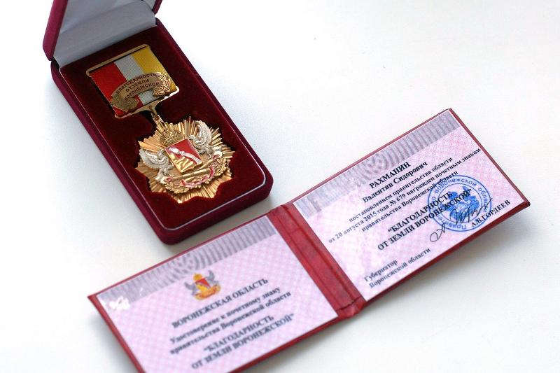 Постановлением Правительства Воронежской области № 679 от 20.08.2015 профессор В.С. Рахманин награжден Почетным знаком «Благодарность от земли Воронежской».