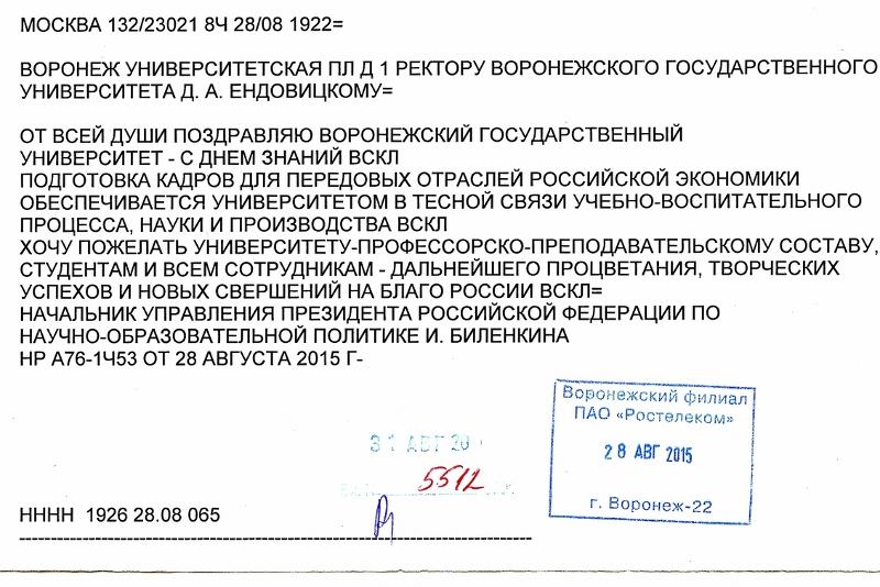 Начальник Управления Президента Российской Федерации по научно-образовательной политике Инна Биленкина поздравила Воронежский государственный университет с Днём знаний.
