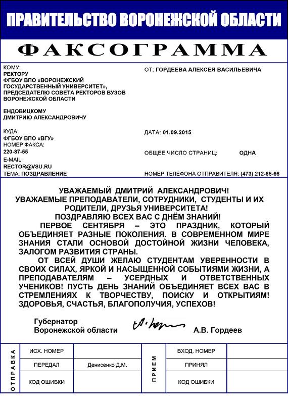 На имя ректора ВГУ, профессора Дмитрия Ендовицкого пришла правительственная телеграмма от губернатора Воронежской области Алексея Гордеева.