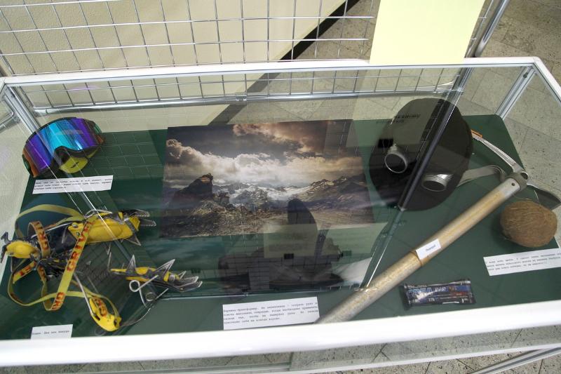 В экспозиции представлены живописные фотографии горных пейзажей участника экспедиции Дмитрия Чернова и то, без чего не сможет обойтись ни один человек, отправляющийся в горы, – ледорубы, кошки, очки.