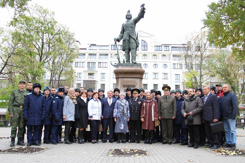 Череду торжественных мероприятий открыло возложение цветов к памятнику Петру I в сквере, который носит имя царя-реформатора. В церемонии приняли участие Антонина Пикуль, дочь писателя Марина Пикуль, председатель Общероссийского Движения Поддержки Флота, капитан первого ранга запаса, член правления Воронежского землячества в Москве Михаил Ненашев, адмирал, заместитель Главнокомандующего ВМФ России в 1991-1999 годах Иван Васильев, а также курсанты и преподаватели факультета военного образования ВГУ и Военно-воздушной академии имени Н.Е. Жуковского и Ю.А. Гагарина.