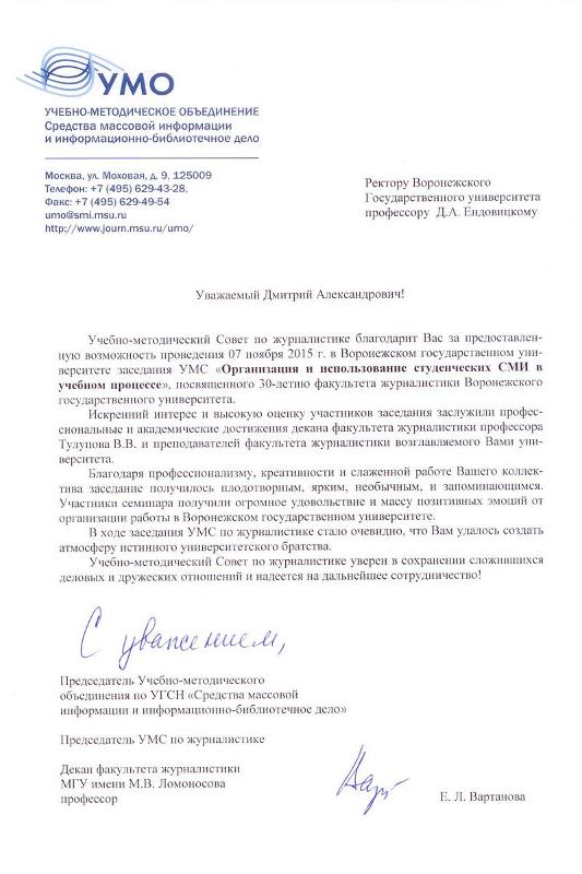 На имя ректора Воронежского государственного университета Дмитрия Ендовицкого получена благодарность от председателя Учебно-методического объединения по УГСН «Средства массовой информации и информационно-библиотечное дело», председателя УМС по журналистике, декана факультета журналистики Московского государственного университета имени М.В. Ломоносова Елены Вартановой за проведение в ВГУ заседания УМС «Организация студенческих СМИ и их использование в учебном процессе».