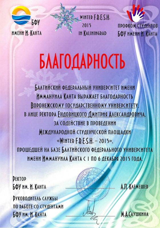 Студентка факультета компьютерных наук Воронежского государственного университета Екатерина Акимова, аспирантка факультета прикладной математики, информатики и механики ВГУ Ирина Тришина и студент факультета ПММ ВГУ Никита Титаренко стали участниками Международной студенческой площадки «Winter F.R.E.S.H.-2015», прошедшей с 1 по 6 декабря в Калининграде на базе Балтийского федерального университета имени Иммануила Канта.