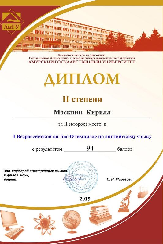 Подведены итоги I Всероссийской онлайн олимпиады для студентов неязыковых специальностей и направлений подготовки, организованной Амурским государственным университетом. Ее участниками стали учащиеся 25 вузов Российской Федерации и Академии Управления при Президенте Республики Беларусь (Республика Беларусь).