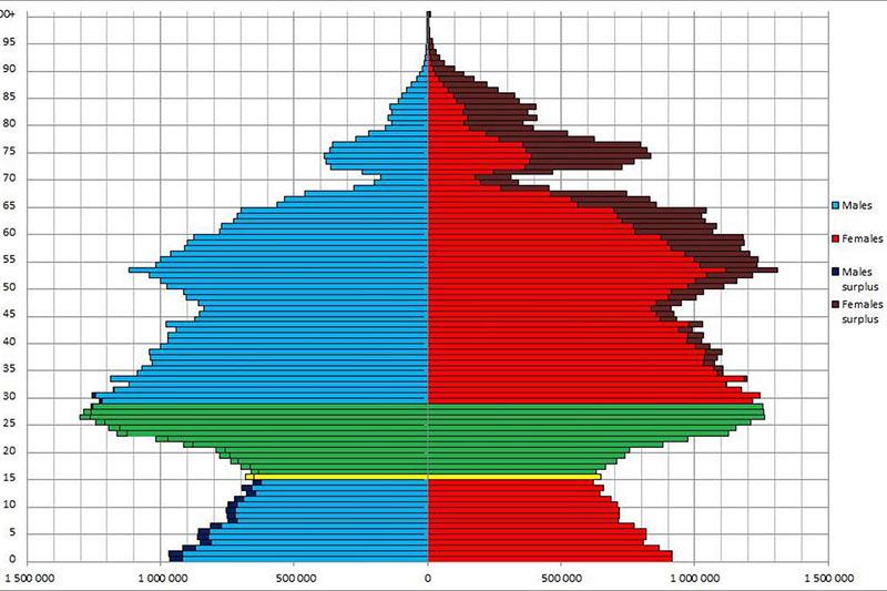 Российские вузы вступают в активную фазу приемной кампании 2015 года. На сегодняшний момент в России сложилась критическая для вузов демографическая ситуация. На диаграмме 1 представлена поло-возрастная пирамида населения России по состоянию на 2014 год. Желтым цветом выделено количество потенциальных абитуриентов 2015 года, молодых людей 1998 года рождения. Зеленым цветом отмечены секторы, иллюстрирующие количество россиян до 30 лет. Диаграмма наглядно показывает, что численность населения России в возрастном интервале от 17 до 30 лет, от которой, в соответствии с законом об образовании, зависит численность бюджетных мест (восемьсот студентов на каждые десять тысяч человек), в предстоящие годы будет неуклонно снижаться. Соответственно, будет снижаться и количество бюджетных мест, выделяемых для отечественных вузов. Ситуация усугубляется тем, что в настоящий момент мы находимся на самом дне демографической ямы и предстоящее уменьшение количества бюджетных мест не может быть компенсировано достаточным притоком договорных студентов.
