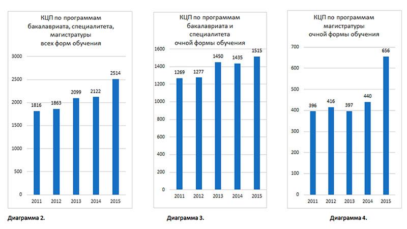 Воронежский государственный университет ставит перед собой задачу не просто выживания, а дальнейшего развития и закрепления своего положения как одного из ведущих вузов страны. Это подтверждается динамикой контрольных цифр приема, выделяемых университету по итогам конкурсов в последние годы. Диаграммы 2, 3, 4 демонстрируют эту динамику по ключевым параметрам – общий объем КЦП по всем формам обучения, а также по очным программам бакалавриата, специалитета и магистратуры.